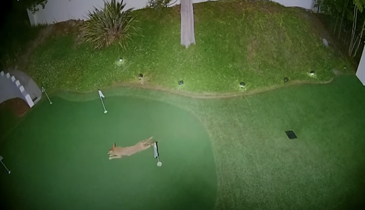 One family in Tarzana, CA, got a close encounter of the adorable kind when their night-censor cameras caught a coyote playing around in their backyard. But then the coyote decided to put Tiger Woods out of business by playing around with a golf ball. Obviously, suburban California is known for big pussies and other killer creatures coming down from the mountains after dark, but the big question here is…who has a mini-golf course in their backyard?